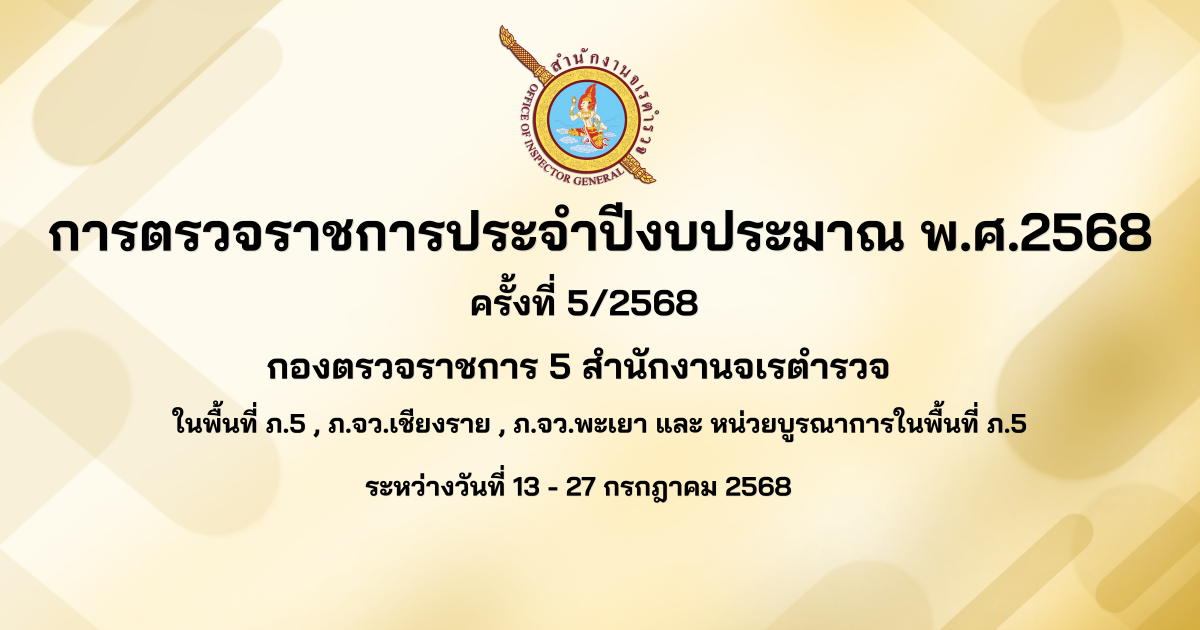 พ.ต.อ.พงษ์พันธ์ แสงสง่า รอง ผบก.กต.5 , พ.ต.อ.วีรศักดิ์ กลั่นเกิด รอง ผบก.กต.5 . พร้อมด้วยคณะตรวจราชการกองตรวจราชการ 5 สำนักงานจเรตำรวจ ได้ตรวจราชการประจำปีงบประมาณ พ.ศ.2568 ครั้งที่ 5/2568 ในพื้นที่ ภ.จว.เชียงราย , ภ.จว.พะเยา และหน่วยบูรณาการในพื้นที่ ระหว่างวันที่ 13 – 27 กรกฎาคม 2568