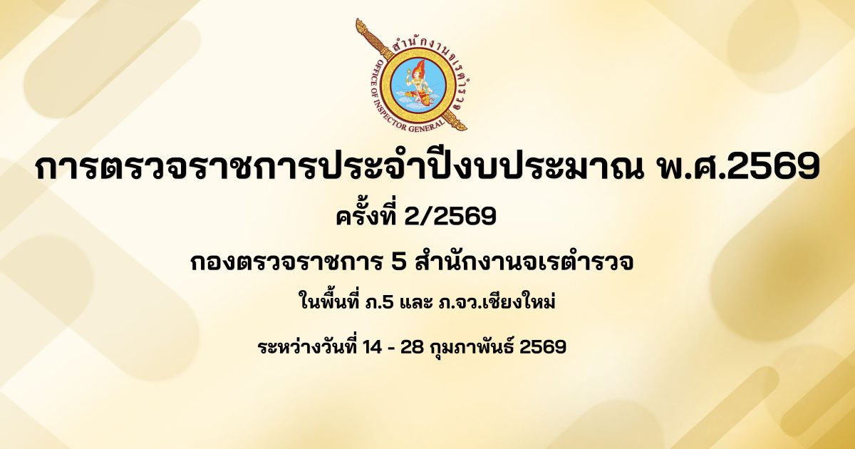 พ.ต.อ.วีรศักดิ์ กลั่นเกิด รอง ผบก.กต.5 , พ.ต.อ.ปิยะกรณ์ ศรีวันทา รอง ผบก.กต.5 พร้อมด้วยคณะตรวจราชการกองตรวจราชการ 5 สำนักงานจเรตำรวจ ได้ตรวจราชการประจำปีงบประมาณ พ.ศ.2569 ครั้งที่ 2/2569 ในพื้นที่ ภ.จว.เชียงใหม่ ระหว่างวันที่ 14 – 22 กุมภาพันธ์ 2569 โดยมี พล.ต.ท.ไตรรงค์ ผิวพรรณ รอง จตช. ร่วมตรวจราชการ ณ สภ.เมืองเชียงใหม่ ,สภ.แม่ปิง , สภ.ภูพิงค์ราชนิเวศน์ , สภ.ช้างเผือก และ พล.ต.ท.มานะ อินพิทักษ์ จตร. ร่วมตรวจราชการ ณ สภ.ดอยสะเก็ด และ สภ.สันกำแพง