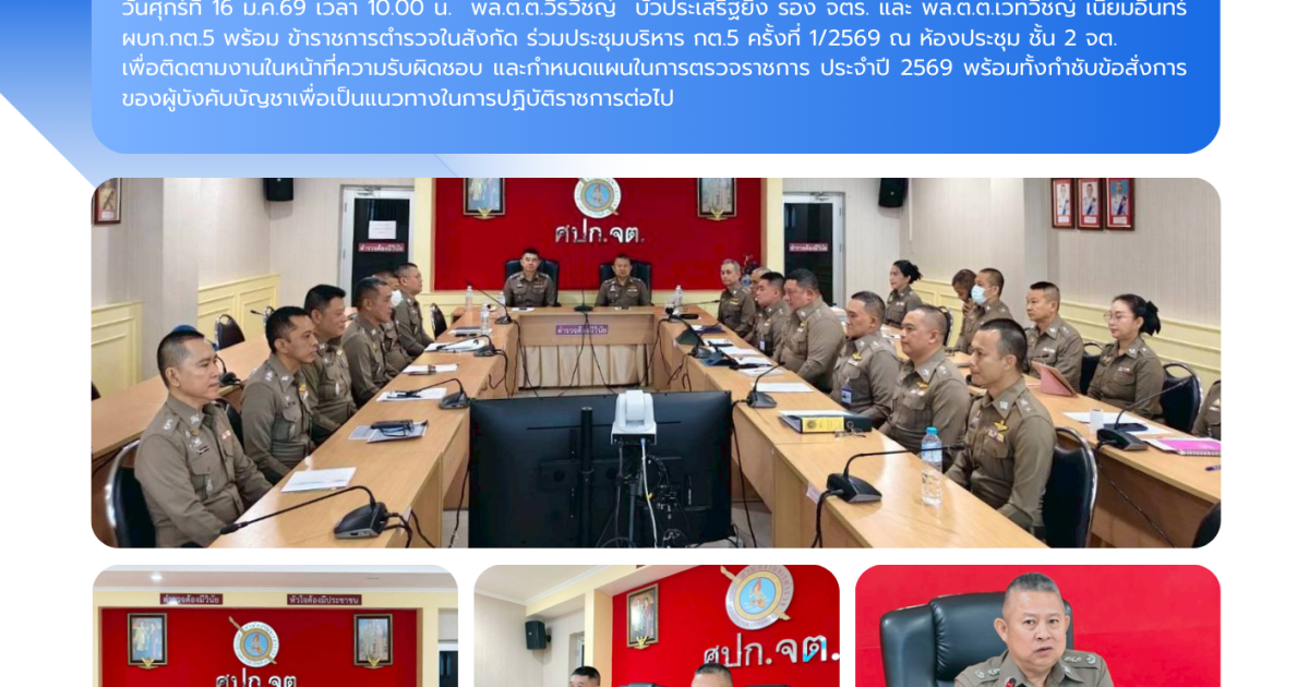 วันศุกร์ที่ 16 ม.ค.69 เวลา 10.00 น. พล.ต.ต.วีรวิชญ์ บัวประเสริฐยิ่ง รอง จตร. และ พล.ต.ต.เวทวิชญ์ เนียมอินทร์ ผบก.กต.5 พร้อม ข้าราชการตำรวจในสังกัด ร่วมประชุมบริหาร กต.5 ครั้งที่ 1/2569 ณ ห้องประชุม ชั้น 2 จต.