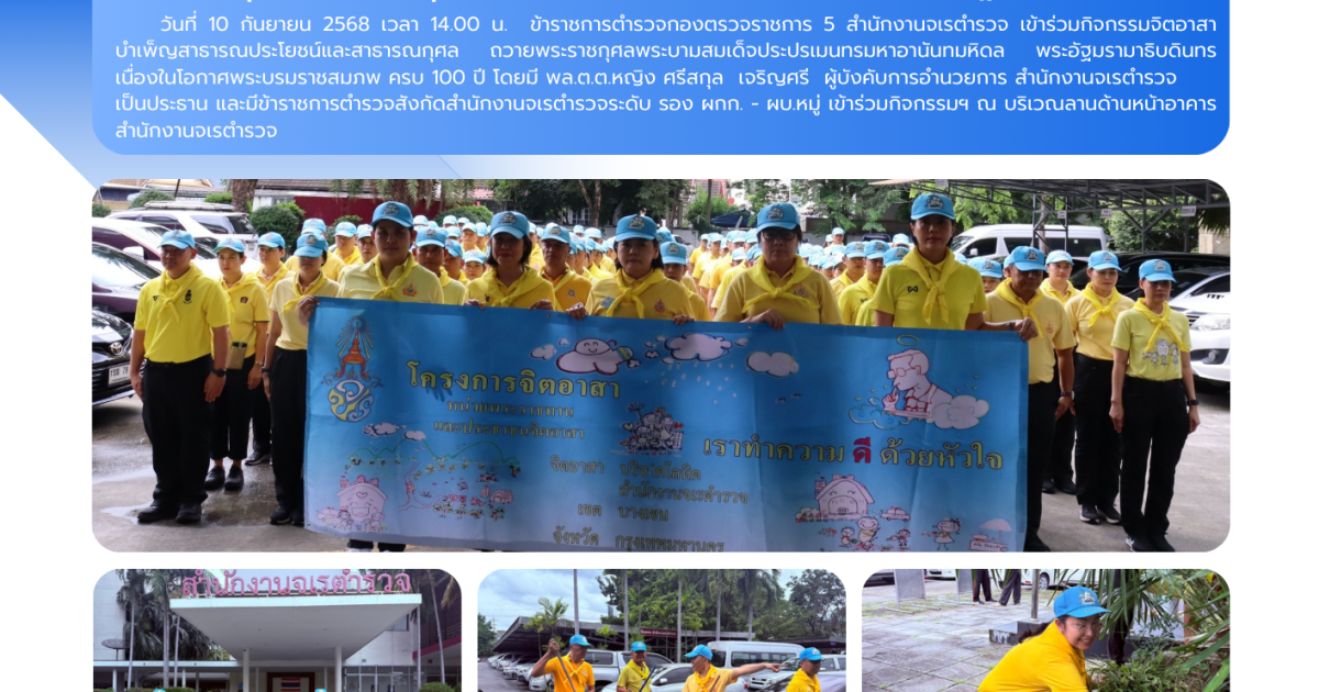 วันที่ 10 กันยายน 2568 เวลา 14.00 น. ข้าราชการตำรวจกองตรวจราชการ 5 สำนักงานจเรตำรวจ เข้าร่วมกิจกรรมจิตอาสาบำเพ็ญสาธารณประโยชน์และสาธารณกุศล ถวายพระราชกุศลพระบามสมเด็จประปรเมนทรมหาอานันทมหิดล พระอัฐมรามาธิบดินทร เนื่องในโอกาศพระบรมราชสมภพ ครบ 100 ปี โดยมี พล.ต.ต.หญิง ศรีสกุล เจริญศรี ผู้บังคับการอำนวยการ สำนักงานจเรตำรวจเป็นประธาน และมีข้าราชการตำรวจสังกัดสำนักงานจเรตำรวจระดับ รอง ผกก. – ผบ.หมู่ เข้าร่วมกิจกรรมฯ ณ บริเวณลานด้านหน้าอาคารสำนักงานจเรตำรวจ