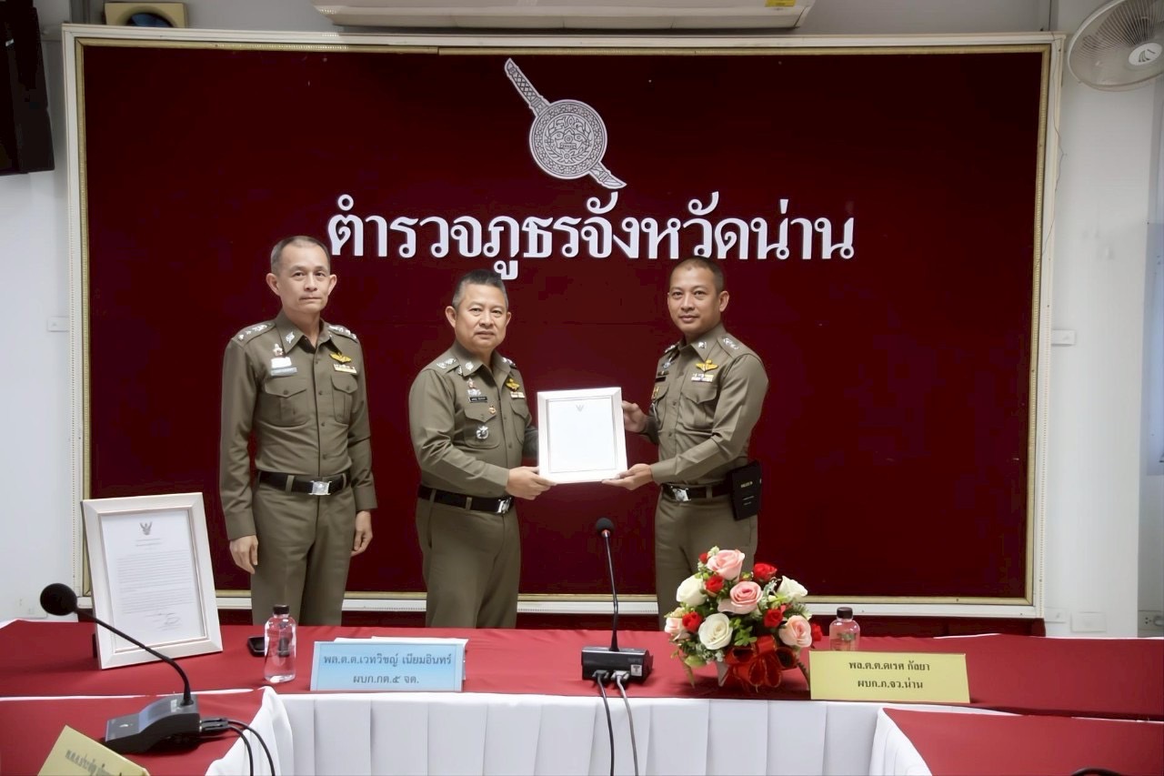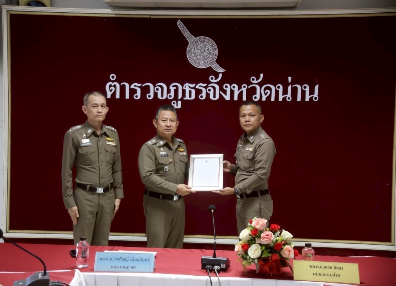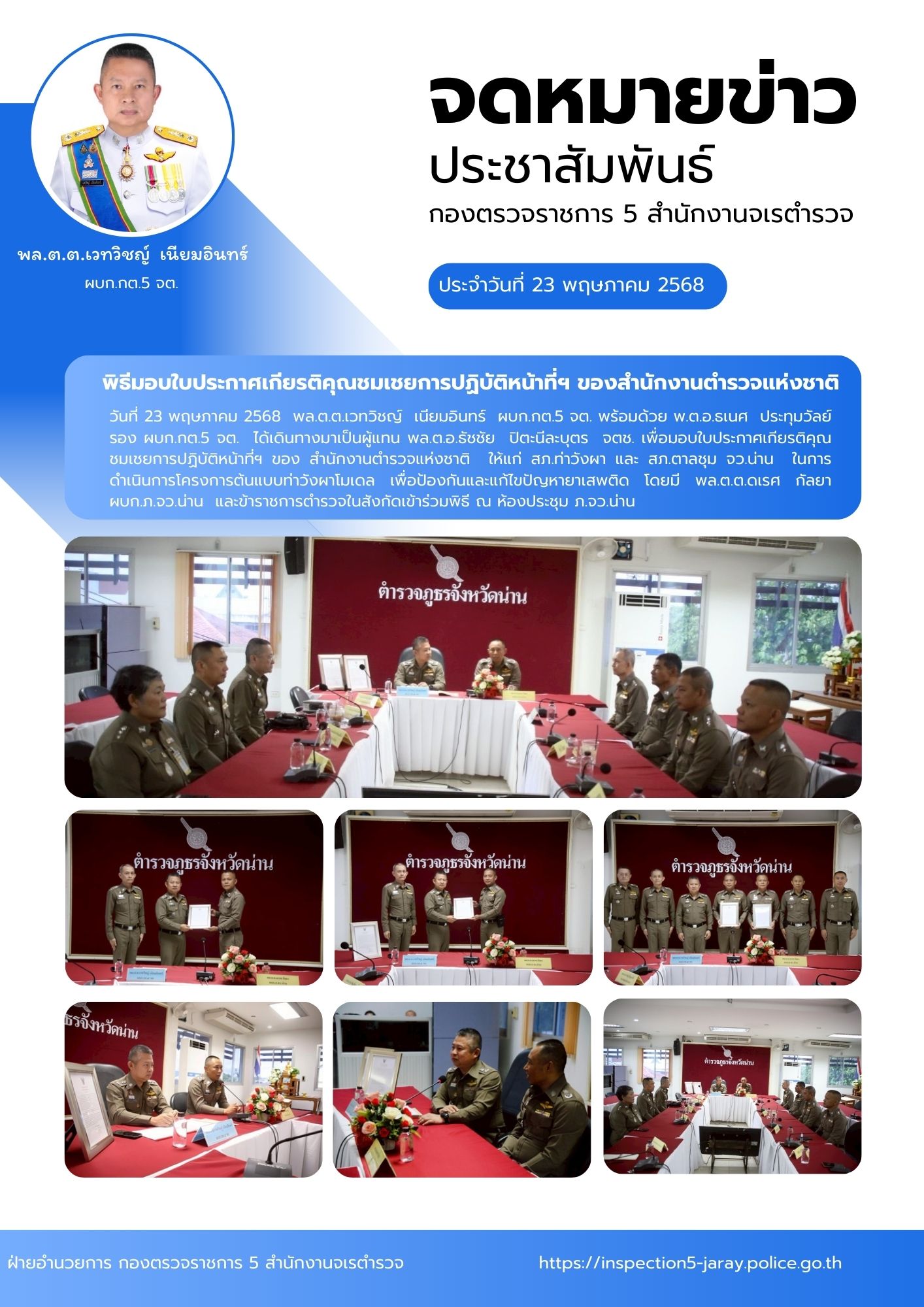 วันที่ 23 พฤษภาคม 2568 เวลา 09.00 น. พล.ต.ต.เวทวิชญ์ เนียมอินทร์ ผบก.กต.5 จต. พร้อมด้วย พ.ต.อ.ธเนศ ประทุมวัลย์ รอง ผบก.กต.5 จต. ได้เดินทางมาเป็นผู้แทน พล.ต.อ.ธัชชัย ปิตะนีละบุตร จตช. เพื่อมอบใบประกาศเกียรติคุณชมเชยการปฏิบัติหน้าที่ฯ ของ สำนักงานตำรวจแห่งชาติ ให้แก่ สภ.ท่าวังผา และ สภ.ตาลชุม จว.น่าน ในการดำเนินการโครงการต้นแบบท่าวังผาโมเดล เพื่อป้องกันและแก้ไขปัญหายาเสพติด โดยมี พล.ต.ต.ดเรศ กัลยา ผบก.ภ.จว.น่าน และข้าราชการตำรวจในสังกัดเข้าร่วมพิธี ณ ห้องประชุม ภ.จว.น่าน
